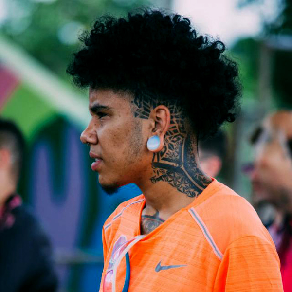 Trans, faz parte dos Meninos Bons de Bola, musicista, tatuador e artista visual.